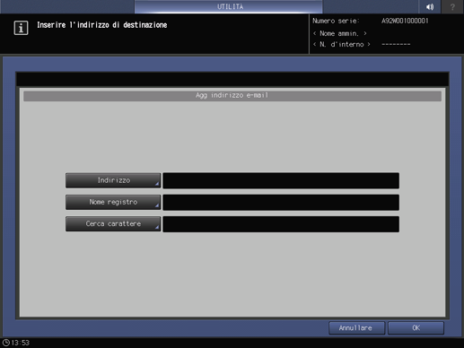 Inserire le informazioni su una destinazione nella schermata Agg indirizzo e-mail. Premendo ogni voce si visualizzano le singole schermate di inserimento dei caratteri.