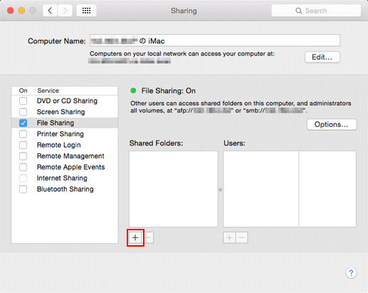 Selezionare la cartella da condividere. Fare clic su + in fondo all'elenco Shared Folder, selezionare una cartella da condividere e fare clic su Add.