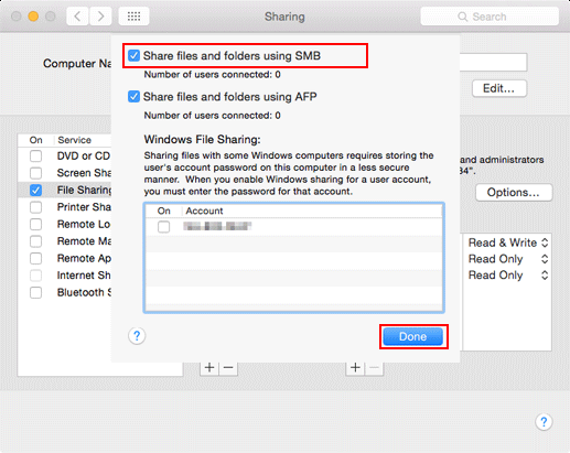Fare clic su Options, verificare che la casella di controllo Share files and folders using SMB sia selezionata, e fare clic su Done.