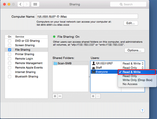 Creare una cartella condivisa sul computer Macintosh. È possibile ricevere i dati di scansione inviati dalla macchina alla cartella condivisa e condividerli con un computer client.
