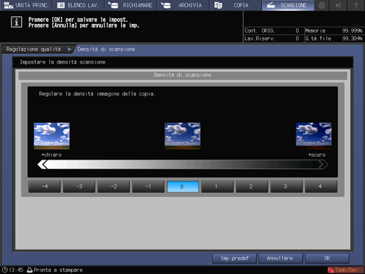 Regolare la densità di scansione dell'intero originale, la densità dello sfondo originale, la tonalità colore, il contorno immagine e il contrasto. Regolare anche il livello uscita di separazione della parte testuale e della parte fotografica di un'immagine o il livello di separazione di colore e bianco e nero nella parte testuale.