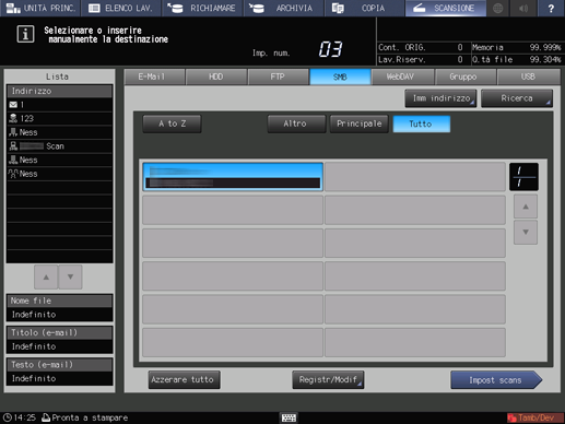 spiegazione aggiuntivaÈ possibile filtrare il nome registro utilizzando A to Z, Altro, o Principale. Per informazioni dettagliate, fare riferimento a Schermata [SCANSIONA].