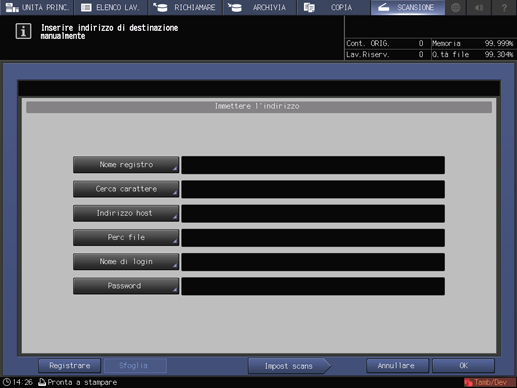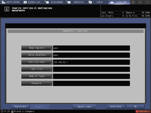 spiegazione aggiuntivaLe impostazioni della schermata Impostazione scansione e l'indirizzo selezionato nella schermata SCANSIONA possono restare fino al riavvio della macchina. Si consiglia di rilasciare l'impostazione e l'indirizzo una volta completata l'operazione.