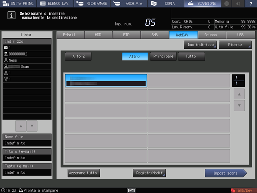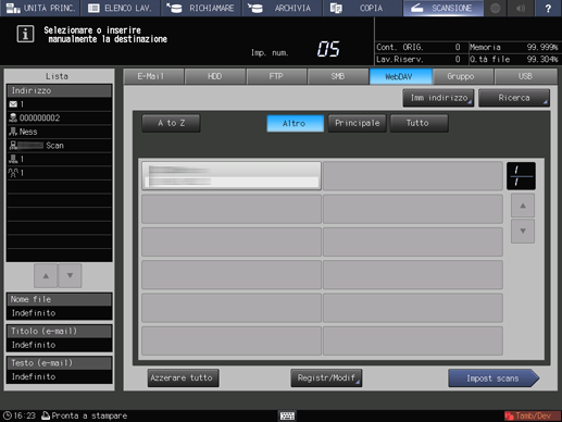 spiegazione aggiuntivaÈ possibile filtrare il nome registro utilizzando A to Z, Altro, o Principale. Per informazioni dettagliate, fare riferimento a Schermata [SCANSIONA].