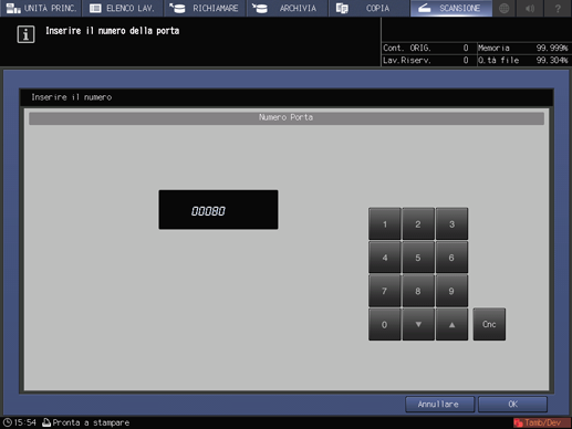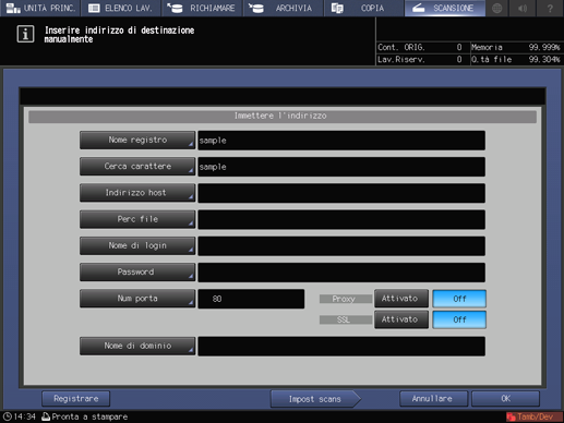 spiegazione aggiuntivaLe impostazioni della schermata Impostazione scansione e l'indirizzo selezionato nella schermata SCANSIONA possono restare fino al riavvio della macchina. Si consiglia di rilasciare l'impostazione e l'indirizzo una volta completata l'operazione.