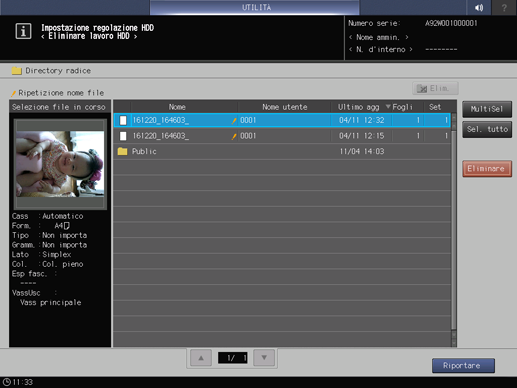 Premere Impostazioni sicurezza nella schermata Menu Impost. amministratore, quindi premere in sequenza Impost gestione HDD e Eliminare lavoro HDD.