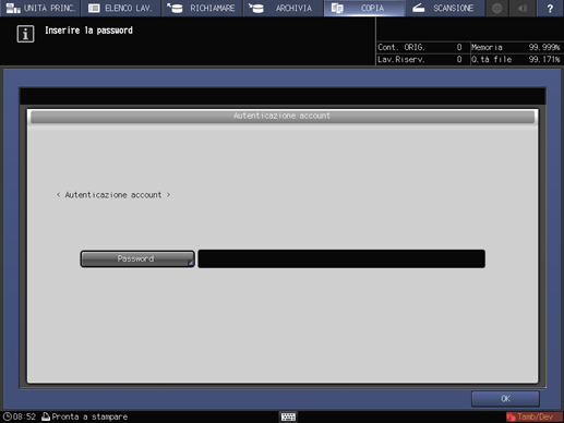 precondizioneSe l'Imp Sicurezza avanzata è impostata su ON, la schermata Autenticazione utente o Autenticazione account è visualizzata ogni volta che un utente tenta di usare una funzione che richiede l'autenticazione. In questo caso, una password più corta di 8 caratteri monobyte non è autenticata. Quando si inserisce una password errata durante l'autenticazione, l'utente deve aspettare 5 secondi prima di inserirla di nuovo.