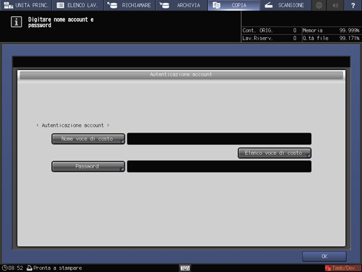 Inserire il Nome utente, Password Utente, Nome account, e/o Password Account, come necessario. Una delle cinque schermate è visualizzata secondo le impostazioni nella schermata Aut.utente/perc.vc.costo. Seguire le istruzioni su ciascuna schermata.