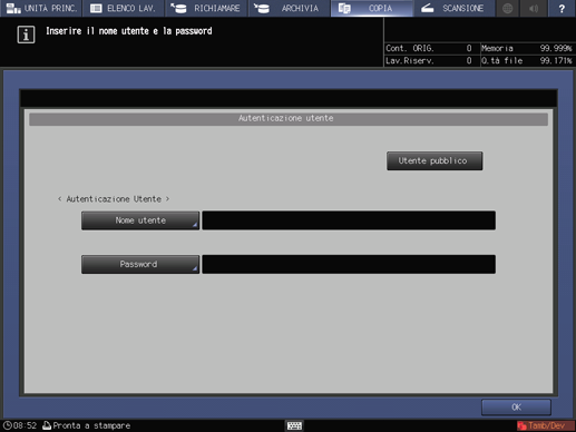 precondizioneSe agli utenti pubblici è consentito usare la macchina, è possibile usare la macchina come utente pubblico premendo Utente pubblico visualizzato nell'area in alto a destra della schermata Autenticazione Utente. L'amministratore configura le funzioni disponibili per gli utenti pubblici e il limite superiore per l'uscita.