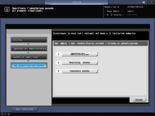 Premere Aut.utente/perc.vc.costo nella schermata Menu Impostazioni amministratore, quindi premere in sequenza Imp.autenticazione utente e Impostazioni amministrative.