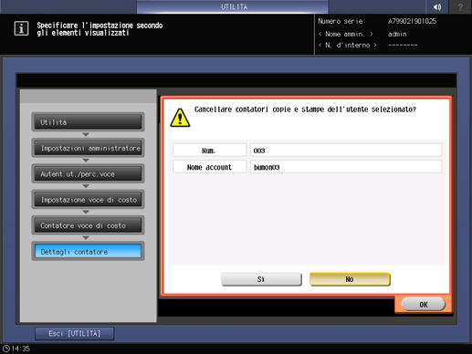 spiegazione aggiuntivaSelezionare una voce e premere Contatore azzerato per visualizzare la finestra di dialogo di conferma. Premere Sì o No, quindi premereOK per completare l'impostazione.