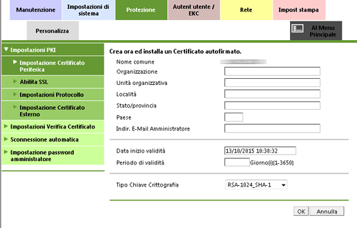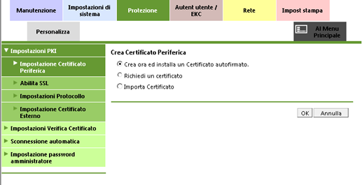 Fare clic sul pulsante di opzione di Crea ora e installa un Certificato autofirmato., quindi fare clic su OK.