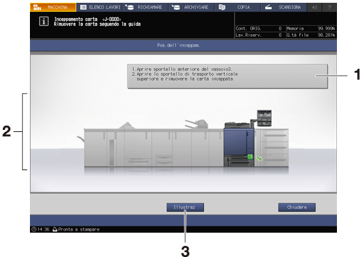 1 | Area messaggi | Spiega con un testo il processo di rimozione della carta inceppata, come indicato nelle illustrazioni. |