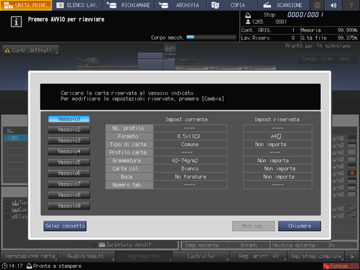Sono visualizzate l'impostazione carta del vassoio selezionato (Impost corrente) e quella richiesta dai dati di stampa (Impost riservata).