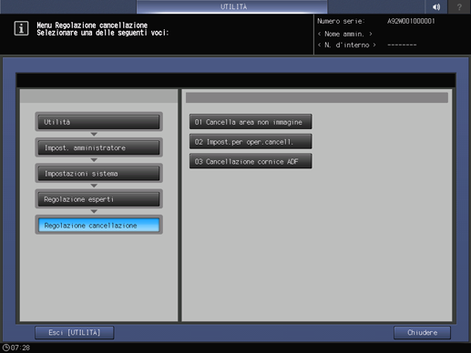 Premere Impostazioni sistema nella schermata Menu Impost. amministratore, quindi premere in sequenza Regolazione esperti, Regolazione cancellazione e Impost.per oper.cancell.