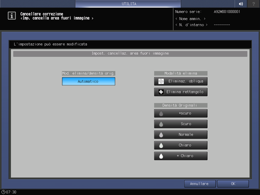Impostare la regolazione cancellazione e la densità originale da usare quando si seleziona la funzione Cancella area non immagine. L'impostazione predefinita è Auto.