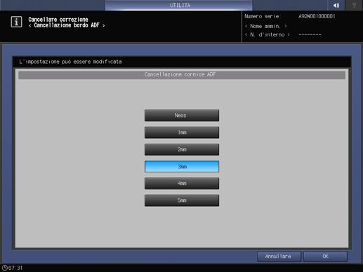 Premere Impostazioni sistema nella schermata Menu Impost. amministratore, quindi premere in sequenza Regolazione esperti, Regolazione cancellazione e Cancellazione cornice ADF.