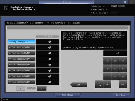 Questa operazione è la stessa di Regolazione - Regolazione macchina - Regolazione stampante - Regolazione Zoom CD, accessibile dalla schermata MACCHINA.