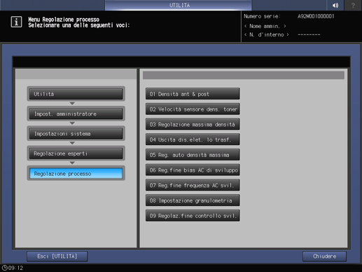 Premere Impostazioni sistema nella schermata Menu Impostazioni amministratore, quindi premere in sequenza Regolazione esperti, Regolazione processo, e Reg. auto densità massima.