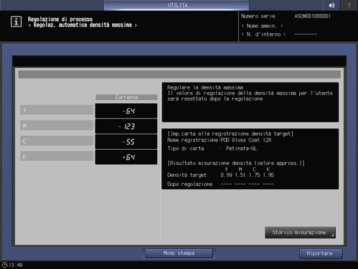 Il risultato della regolazione automatica è visualizzato in Dati correnti. Tali valori si riflettono in [Regolazione massima della densità].
