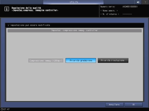 Questa impostazione è valida solo per le immagini emesse a 1200 dpi da elaborare da parte del Controller immagine. Né la macchina, né il Controller immagine necessitano di un'operazione di riavvio dopo la modifica dell'impostazione.