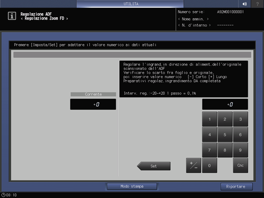 Premere Impostazioni sistema nella schermata Menu Impost. amministratore, quindi premere in sequenza Regolazione esperti, Regolazione ADF e Regolazione Zoom FD.