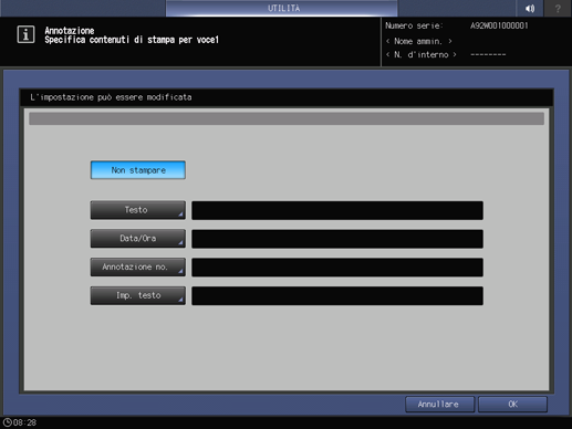 Selezionare una delle voci tra Testo, Data/Ora, e Annotazione no. quindi impostare i contenuti da stampare.