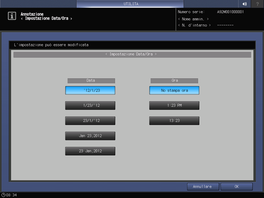 spiegazione aggiuntivaPremere Data/Ora per visualizzare la schermata Impostazione Data/Ora. Selezionare una delle opzioni Data e una delle opzioni Ora, quindi premere OK.