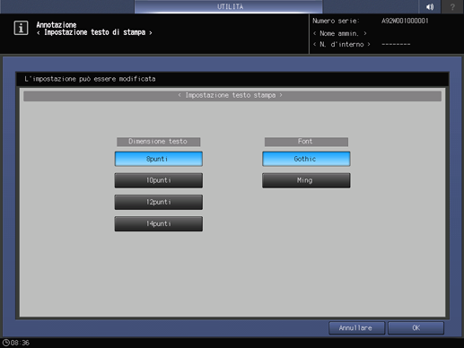 spiegazione aggiuntivaPremere Imp. testo per visualizzare la schermata Impostazione testo stampa. Selezionare una delle opzioni Dimensione testo e una delle opzioni Font, quindi premere OK.