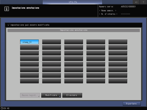 Impostare e registrare dapprima le impostazioni necessarie sull'utilizzo della funzione Annotazione di Stamp nella schermata Applicazione. È possibile registrare fino a 40 serie di impostazioni annotazione. È anche possibile modificare o eliminare le annotazioni registrate.