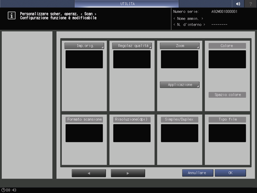 Premere Impostazioni sistema nella schermata Menu Impost. amministratore, quindi premere in sequenza Personal. scherm. operazioni e Imp. person. scherm. scan.