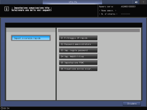 Premere Impostazioni di rete nella schermata Menu Impostazioni amministr sistema, quindi premere in sequenza Impost.sicurezza rapida e Visualizza avviso sicur.