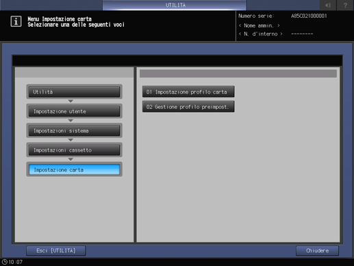 Premere Impostazioni sistema nella schermata Menu Impostazione utente, quindi premere in sequenza Impostazioni cassetto e Impostazioni carta.