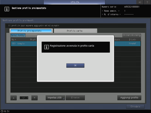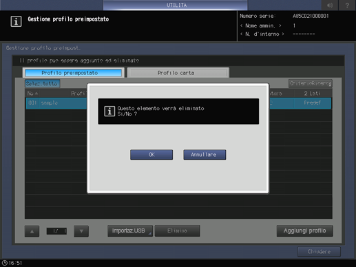 Per aggiungere un nuovo profilo preimpostato a questa macchina è necessaria un'impostazione di assistenza. Per ulteriori dettagli, contattate il tecnico dell'assistenza.