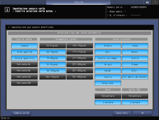 Selezionare i criteri carta del vassoio da selezionare automaticamente nella modalità Carta Auto (APS).