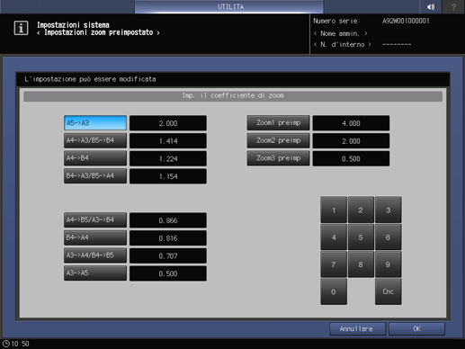 Premere Impostazioni sistema nella schermata Menu Impostazione utente, quindi premere Imp. il coefficiente di zoom.