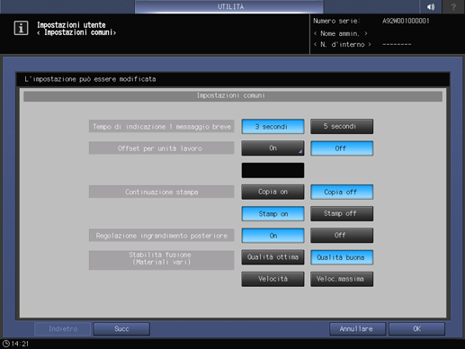 Tempo di indicazione 1 messaggio breve | Selezionare l'intervallo di tempo per visualizzare un messaggio breve, come Il formato originale è A4, nell'area dei messaggi del pannello a sfioramento. | 3 secondi, 5 secondi |