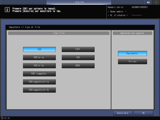 Tipo file predefinito USB | Selezionare il valore predefinito di Tipo file per Invio a USB. | PDF Unico PDF Diviso PDF compresso/A-1a PDF Diviso/A-1a PDF compresso/A-1b PDF Diviso/A-1b PDF compatto compresso PDF compatto diviso PDF/A-1a compatto compresso PDF/A-1a compatto diviso PDF/A-1b compatto compresso PDF/A-1b compatto diviso TIFF Unico TIFF Diviso XPS pacch. XPS diviso JPEG | |