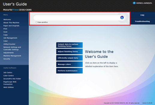 Il campo di ricerca in cima al manuale può essere usato per ricercare le informazioni necessarie dal Manuale utente. Inserire una parola chiave nel campo di immissione e fare clic su