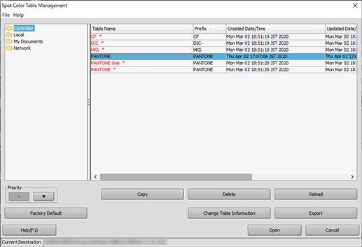 Zeigen Sie eine Liste der im Bildcontroller registrierten Schmuckfarbentabellen an, um sie zu verwalten.