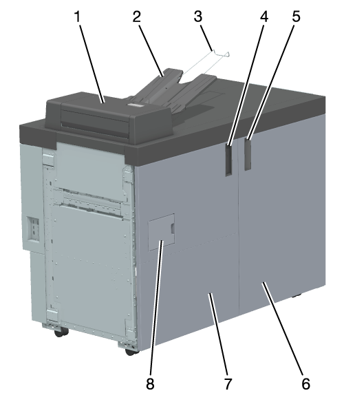 6 | Rechte Seitenklappe der Beschnitteinheit | Diese Klappe zum Beseitigen eines Papierstaus oder zum Wechseln einer internen optionalen Komponente öffnen. |