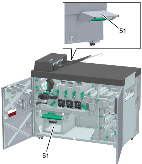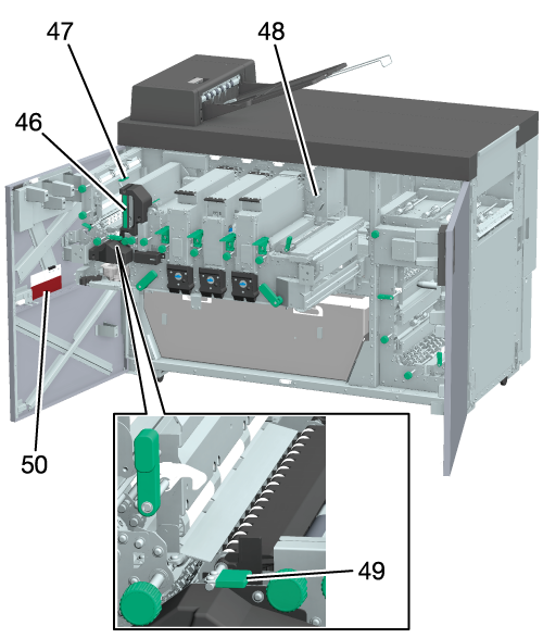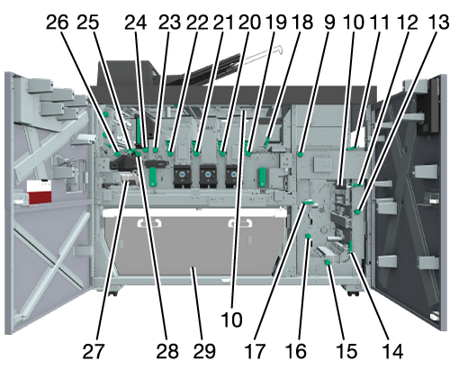 7 | Linke Seitenklappe der Beschnitteinheit | Diese Klappe zum Beseitigen eines Papierstaus oder zum Wechseln einer internen optionalen Komponente öffnen. |