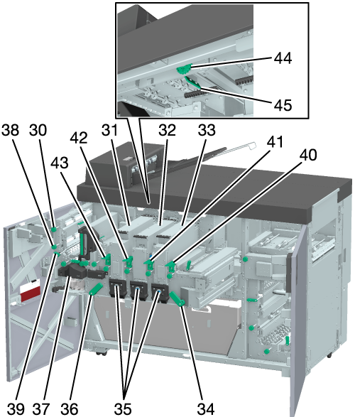 31 | Beschnitteinheit TU-504/Rilleneinheit CR-103/Perforationseinheit PE-101 (optional) | Beschnitteinheit TU-504: Beschneidet den Bundsteg horizontal in Papiereinzugsrichtung. Rilleneinheit CR-103: Bringt aufwärtskonvexe Rillen (Falzlinien) auf dem Papier an. Perforationseinheit PE-101: Bringt eine Perforation in Papiereinzugsrichtung an. * Nur eins der folgenden optionalen Geräte kann auf diesem System installiert werden. |