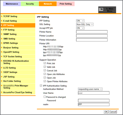 [Operation unterstützt] | [Druckauftrag] | Legt das Element fest, das den IPP-Betrieb erlaubt. Erlaubt die Verwendung der Elemente, deren Kontrollkästchen aktiviert sind. |