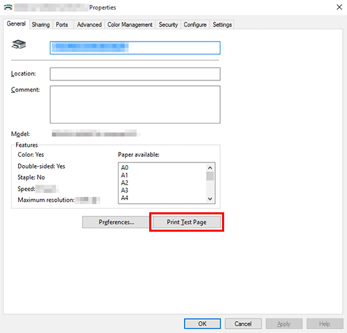Windows proporciona la función de impresión de prueba. Realice una impresión de prueba para comprobar si es posible imprimir correctamente.