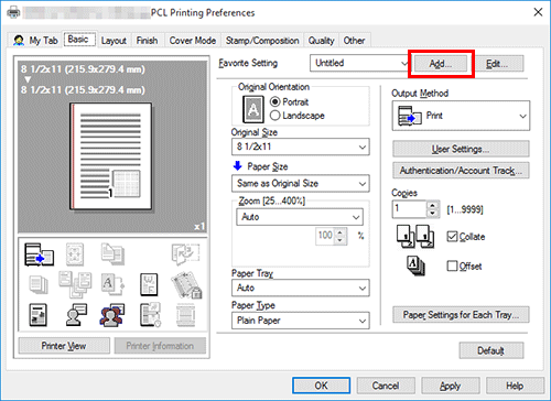 En la ventana [Preferencias de impresión], puede definir las condiciones de impresión que desee registrar como favoritas.