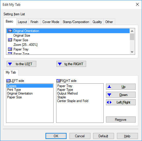 Al hacer clic en [hacia la IZQU.], la función seleccionada se coloca en el área de la izquierda de [My Tab] y al hacer clic en [hacia la DER.], se coloca en el área de la derecha de [My Tab].