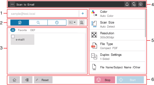1 | Área de visualización del destino | Muestra los destinos especificados. Si se especifican dos o más destinos, se indica el número de destinos mediante [+N] (N: número). Si toca mientras se especifica el destino, se visualiza la pantalla con la lista de destinos. Es posible verificar, editar o borrar los destinos especificados. Puede tocar [+] para introducir directamente la información de destino y añadir un destino nuevo. |