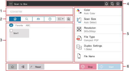 1 | Área de visualización del destino | Muestra los destinos especificados. Si se especifican dos o más destinos, se indica el número de destinos mediante [+N] (N: número). Si toca mientras se especifica el destino, se visualiza la pantalla con la lista de destinos. Es posible verificar, editar o borrar los destinos especificados. |