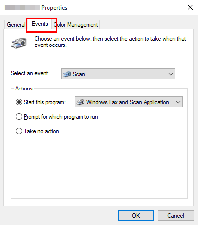 Instale el controlador de escáner necesario para Escaneado WSD en un ordenador. A continuación, configure las operaciones que deben efectuarse después del envío de escaneado en el controlador de escáner. Este ejemplo muestra el procedimiento para Windows 10.
